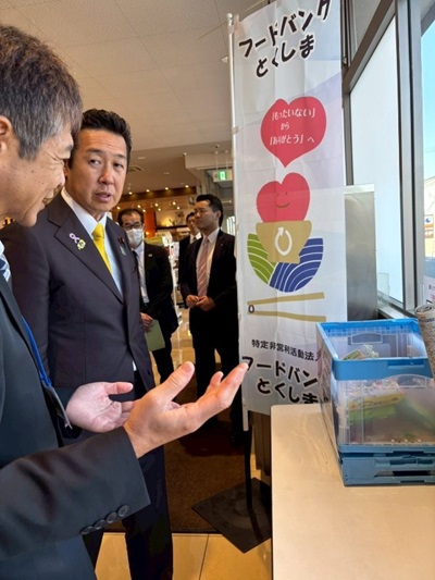 次に、とくしま生協コープ住吉店にて、「てまえどり」や「フードバンク」といった食品ロス削減に向けた取組の現場を視察しました。