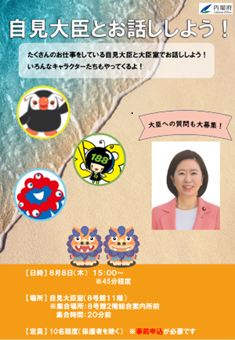 たくさんのお仕事をしている自見大臣と大臣室でお話ししよう!