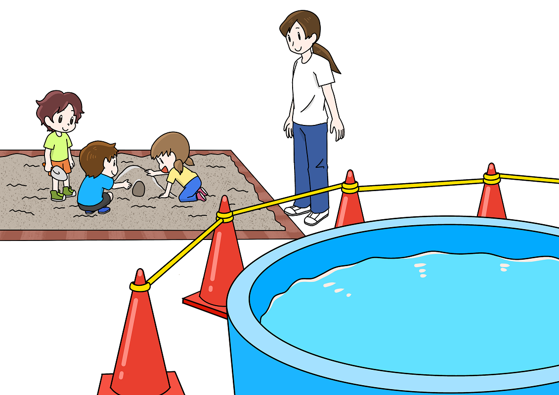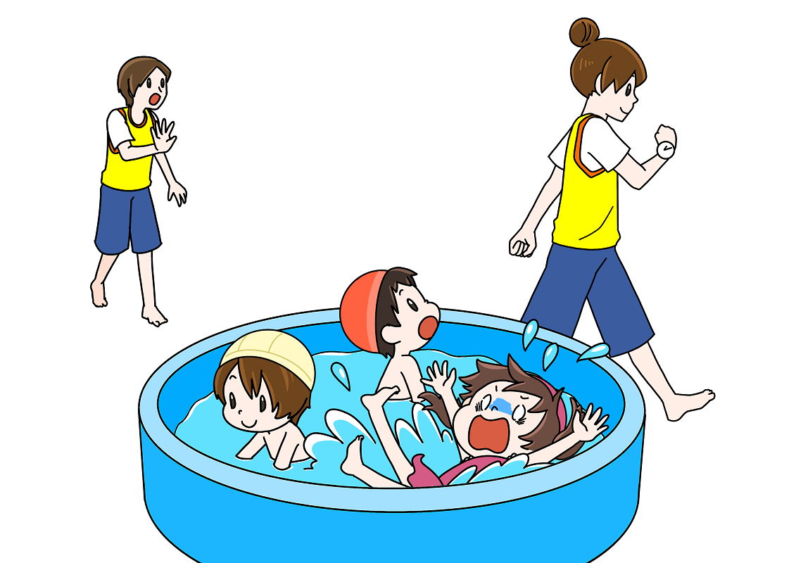 幼稚園、保育所及び認定こども園におけるプール活動・水遊びの際の監視や指導、子供たちの危ない行為のイラストです。