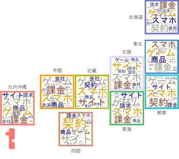 テキストマイニング技術の一種であるトピックモデリング※を用いて、全国を9地区(北海道、東北、関東、北陸、東海、近畿、中国、四国、九州沖縄)に分けた上で、各地区の消費生活相談データについて分析を行い、相談におけるトピック(主要なテーマ)の代表的なキーワード20語を抽出し、相談に出てくる確率がより高い(より出現しやすい)キーワードが大きくなるように処理を施した上で、日本地図上に表示しています。