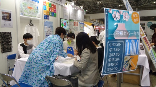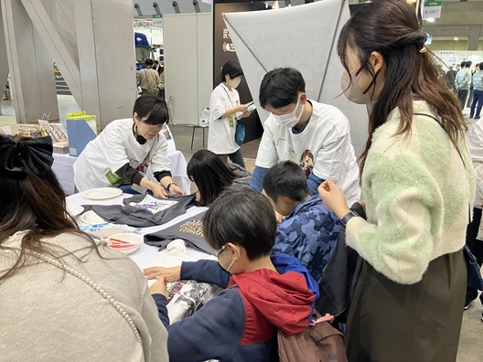 「エコプロ2024」の今年のテーマ「SX(サステナビリティ・トランスフォーメーション)」に沿って、人や社会、地域、環境などに配慮して作られた食品、日用品、雑貨などの商品を展示し、どのようなことを考えながらお買物をすることが、世界の未来を変えるエシカル消費(食品ロス削減を含む)につながるのかを提案し、パネルの展示や動画の放映と共に、啓発チラシなどの配布を行いました。また、「全てを無駄にしない」をコンセプトにサステナブル素材を活用したアパレル事業を展開している企業と、日頃から環境や復興支援などをテーマに積極的に活動している大学生の協力によるワークショップを行いました。当ブースへは3日間で約2000人来場者がありました。