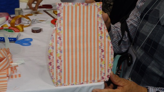 商品として販売できない衣類を細かく粉砕、繊維状にしたものを使用済み牛乳パックなどの古紙に混ぜて作られた混抄紙(こんしょうし)に、廃棄する布やボタンなどを自由に貼り付けてオリジナルのペットボトル花瓶カバーを作りました。