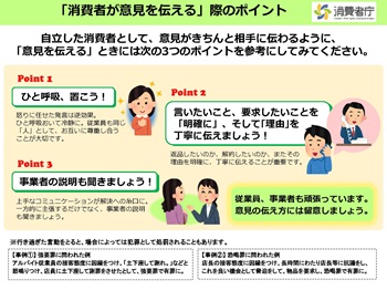消費者が、消費者市民社会の一員として事業者に適切に意見を伝えることは、事業者が提供する商品・サービスの改善を促すことにつながり、特に、事業者の問題行動等に対する申入れは、消費者の正当な権利の行使です。