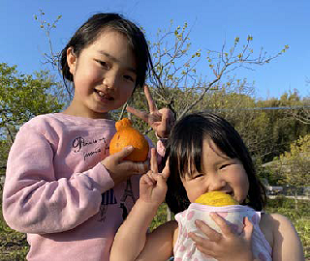 「7歳と3歳の娘が訳ありミカンを持ってお話ししました。
