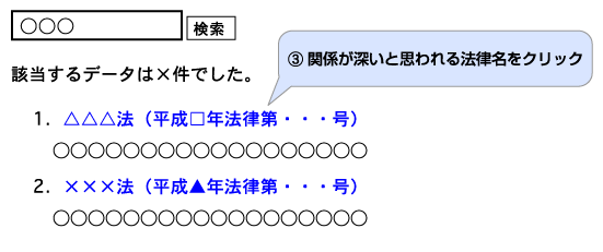 - (2)検索結果が表示されます。ご覧になりたい法律名をクリックして下さい。