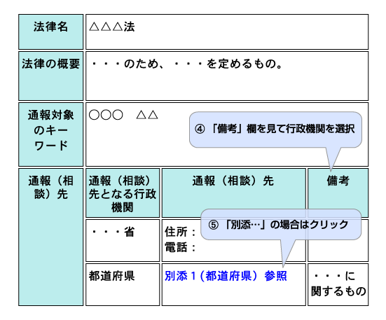 - (3)通報・相談先一覧が表示されます。備考欄をご参照の上、該当する行政機関にご連絡ください。