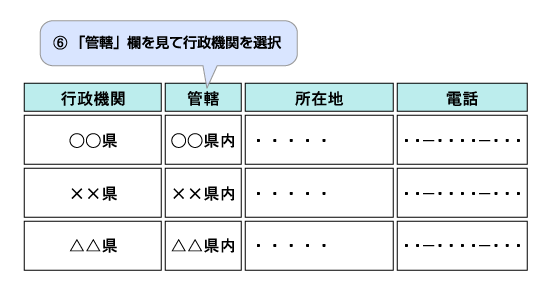 - (4)通報(相談)先が「別添...」の場合は、クリックすると地域別の一覧が表示されますので、「管轄」をご覧になり、該当する行政機関にご連絡ください。