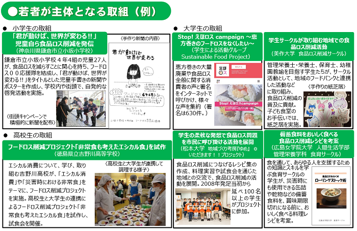 食品ロス削減に向けた取組を行っている団体等を御紹介します。地方公共団体、民間、生徒・学生における取組を参考に、身近なところから食品ロスを減らしてみませんか。