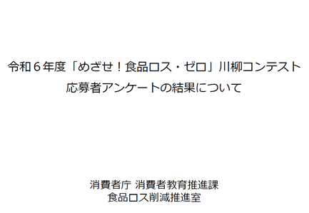 令和6年度「めざせ!食品ロス・ゼロ」川柳コンテストアンケート結果公表 令和6年度「めざせ!食品ロス・ゼロ」川柳コンテストアンケート結果の公表 川柳応募時にアンケートを実施しましたので、その結果を公表いたします。 令和6年度「めざせ!食品ロス・ゼロ」川柳コンテスト応募者アンケートの結果について [PDF:582KB] 担当:消費者教育推進課 ページの先頭へ