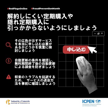 消費者庁は、国境を越えた不正な取引行為を防止するための取組を促進する国際ネットワークであるICPEN(※)に参画しています。その取組の一つである「詐欺防止月間(Fraud Prevention Month)」では、加盟国それぞれがテーマに沿った注意喚起などを実施しています。消費者の皆様におかれましては、このキャンペーンを、詐欺被害の未然防止に役立ててください。