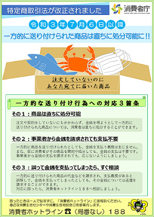 - 【1】売買契約に基づかないで送付された商品に係る改正規定(特定商取引法第59条及び第59条の2)は、令和3年7月6日に施行されました。