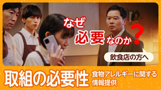 【動画】外食・中食での食物アレルギーについて(基礎編) 【動画】ショート動画 外食・中食における食物アレルギーの現状 取組の必要性 食物アレルギーに関する情報提供 従業員の意識と行動を変えるには メニューの企画・開発時のポイント 調理時のポイント 接客時のポイント 事故が発生したら 外食・中食を利用する際の注意点 【動画】外食・中食での食物アレルギーについて(基礎編) 全体向け 外食・中食における食物アレルギーの現状(動画はこちら) エピペンの使い方を含む緊急時対応はこちら 一般社団法人日本アレルギー学会「アナフィラキシーガイドライン2022」 東京都「食物アレルギー緊急時対応マニュアル(2022年1月版)」 英語字幕付き(With English subtitles)はこちら 中国語字幕付き(附中文字幕)はこちら ベトナム語字幕付き(Có phụ đề tiếng Việt)はこちら 外食・中食の経営者向け 取組の必要性 食物アレルギーに関する情報提供(動画はこちら) 従業員の意識と行動を変えるには(動画はこちら) エピペンの使い方を含む緊急時対応はこちら 一般社団法人日本アレルギー学会「アナフィラキシーガイドライン2022」 東京都「食物アレルギー緊急時対応マニュアル(2022年1月版)」 英語字幕付き(With English subtitles)はこちら 中国語字幕付き(附中文字幕)はこちら ベトナム語字幕付き(Có phụ đề tiếng Việt)はこちら 外食・中食の従業員向け 取組の必要性 食物アレルギーに関する情報提供(動画はこちら) メニューの企画・開発時のポイント(動画はこちら) 調理時のポイント(動画はこちら) 接客時のポイント(動画はこちら) 事故が発生したら(動画はこちら) エピペンの使い方を含む緊急時対応はこちら 一般社団法人日本アレルギー学会「アナフィラキシーガイドライン2022」 東京都「食物アレルギー緊急時対応マニュアル(2022年1月版)」 英語字幕付き(With English subtitles)はこちら 中国語字幕付き(附中文字幕)はこちら ベトナム語字幕付き(Có phụ đề tiếng Việt)はこちら 患者・ご家族向け 外食・中食を利用する際の注意点(動画はこちら) 英語字幕付き(With English subtitles)はこちら 中国語字幕付き(附中文字幕)はこちら ベトナム語字幕付き(Có phụ đề tiếng Việt)はこちら アンケートのお願い 動画についてのアンケート 担当:食品表示課 おすすめコンテンツ 機能性表示食品について 栄養成分表示を表示される方へ ページの先頭へ