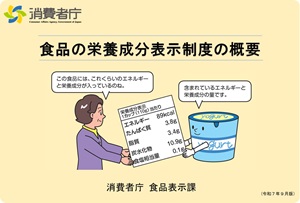 容器包装に入れられた一般用加工食品及び添加物には、食品表示基準に基づき、栄養成分の量及び熱量の表示(栄養成分表示)が義務付けられています。