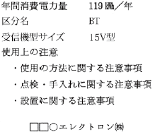 - この表示の必要な対象範囲は、テレビジョン受信機(直視型の蛍光管バックライトを使用した液晶パネル又はプラズマディスプレイパネルを有するものに限る)で、交流の電路(定格周波数50ヘルツ又は60ヘルツ、定格電圧100ボルト)に使用されるものとする。