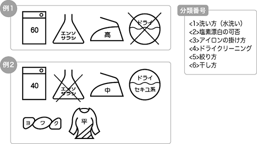 日本工業規格 JIS L0217(繊維製品の取扱いに関する表示記号及びその表示方法)の抜粋です。