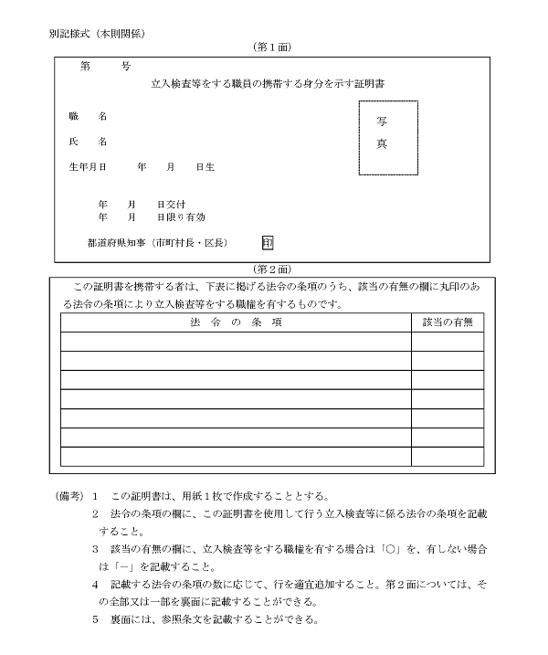 家庭用品品質表示法第十九条第二項の規定(都道府県知事又は市長の事務に係るものに限る。)に基づく立入検査の際に職員が携帯するその身分を示す証明書は、家庭用品品質表示法に基づく申出の手続等を定める命令(平成二十一年内閣府・経済産業省令第三号)第二条第一項の規定にかかわらず、別記様式によることができる。