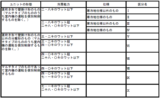 - (二)区分名の表示に際しては、次の表のユニットの形態欄、冷房能力欄、仕様欄に応じそれぞれ同表の区分名欄に掲げる用語を用いて表示すること。ただし、水蒸発式のもの及びヒートポンプ暖房又は電熱装置のみによる方法以外の方法による暖房を行うものについては、区分名を省略することができる。
