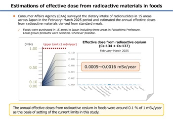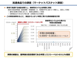 消費者庁食品衛生基準審査課(旧厚生労働省食品基準審査課)では、国立医薬品食品衛生研究所に委託して、年に2回、市場で流通する食品を購入し、平均的な食生活における食品中の放射性物質(放射性セシウム、放射性ストロンチウム、放射性プルトニウム)の濃度および摂取量を調査し、ヒト一人が食品から受ける年間放射線量を推定しています。